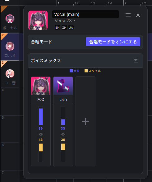 ACE Studioでは、シンガーを選ぶのではなく「作る」感覚です。 「ベースのAさんを70%、ハスキーなBさんを30%」というようにブレンドし、世界に一人だけのハイブリッド・ボイスを錬成できます。