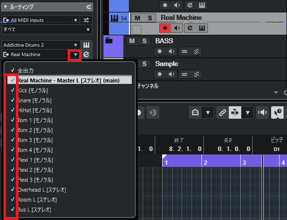 Out 1(Master)は全パーツをまとめた音が出ています。 - 注意点: 個別設定を終えたら、Cubase側で