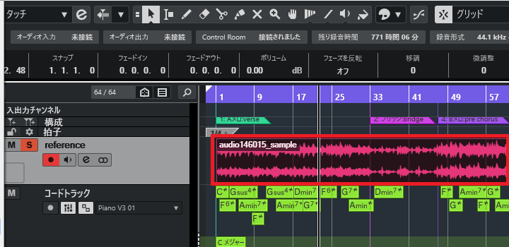リファレンスなどのオーディオデータは一定のBPMではなく、テンポが変化することがあります。下記の1~3のいずれかの方法で対処します。1が簡単で初心者にはおすすめです2,3はこだわってオーディオデータまたはプロジェクトの一方を他方に正確に合わせる方法です。