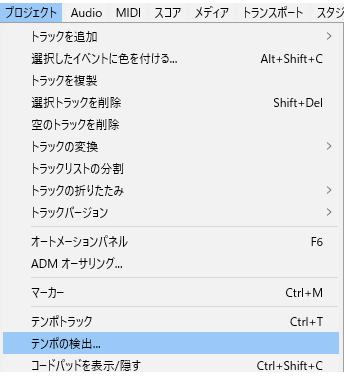 メニューバーから「プロジェクト」→「テンポの検出」を選択します