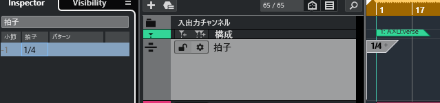 実際の楽曲の拍子(例:4/4拍子)に合わせるため、拍子トラック上で適切な拍子を手動で設定します。Inspectorで拍子を変更します。