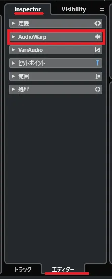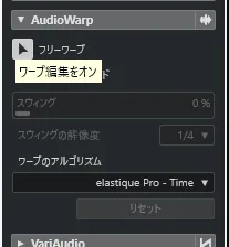 プロジェクトウインドウの左ゾーン「Inspector」にある「AudioWarp」セクションの「フリーワープ」モードをオンにします。