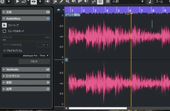 • テンポ同期: プロジェクトのテンポを変更しても、オーディオワープを適用することで、オーディオ素材が新しいテンポに自然に追従します。