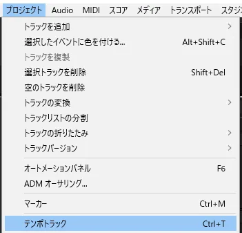メニューバーから「プロジェクト」→「テンポトラック」を選択します。(ショートカットキー [Ctrl]+[T]/Macの場合は [Command]+[T]))