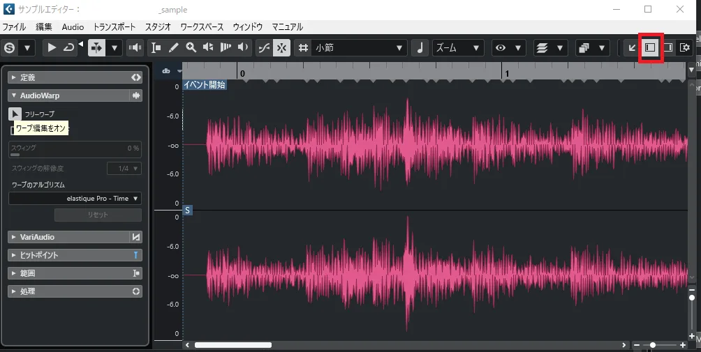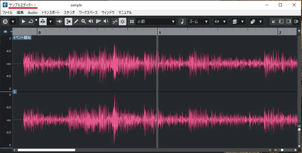 オーディオイベントをクリックしてサンプルエディターを出します。