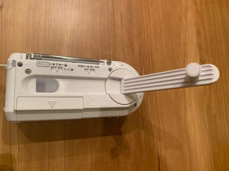 手回し+乾電池のシンプル構成。USBやソーラーは便利だが、災害時は壊れやすく長期保存時に不安要素となります。乾電池ストックと手回しで十分に冗長性が確保できます。