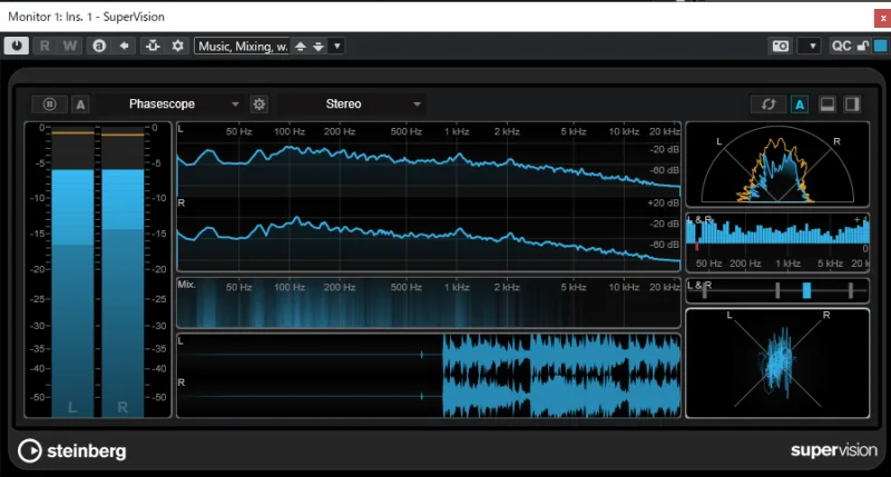 SuperVisionとは、Cubaseに付属している位相解析を行うための標準プラグインです。このプラグインは、レベル、スペクトラム、位相、波形など、さまざまなオーディオ情報を視覚的に分析するためのプロフェッショナルなツールです。特に、位相に関するモジュールを活用することで、オーディオ信号のチャンネル間の位相関係や左右バランスを詳細に視覚化できます。