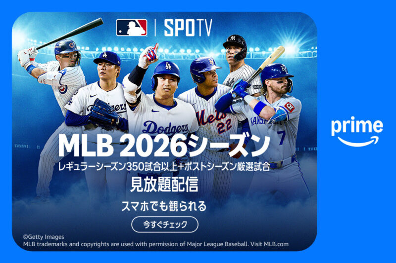 Amazonプライム会員(月額600円)なら、Prime VideoのSPOTVチャンネルで2026年MLBレギュラーシーズン350試合以上を追加料金ゼロで視聴できます。大谷翔平・山本由伸・佐々木朗希らドジャース勢をはじめ、村上宗隆・岡本和真のメジャー初挑戦も追えます。昨シーズンの54試合から約7倍に拡大した、歴史的な配信規模です。