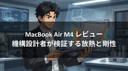 MacBook Air M4のファンレス放熱は限界か?筐体剛性は?現役の機構設計者が物理的視点で徹底検証。M1との比較や、長く使うための熱対策、ヒンジの耐久性まで、スペック表には載らない「真実」を正直にレビューします。
