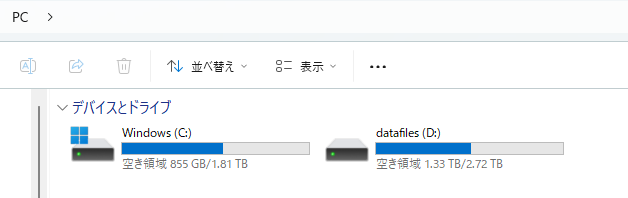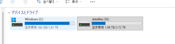 Dドライブには1TB以上のデータが移動しましたが、それでもまだ1.33TBの余裕があり、非常にバランスの良いストレージ構成になりました。