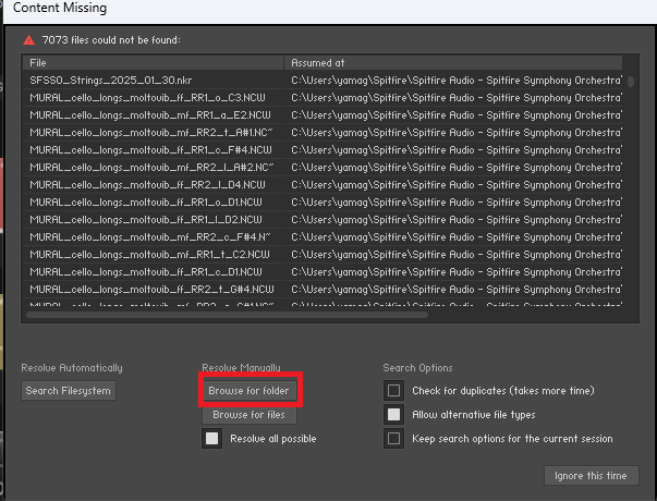 フォルダ移動後、DAWでKontaktを立ち上げると、「Content Missing(ファイルが見つかりません)」というエラー画面が出ることがあります。